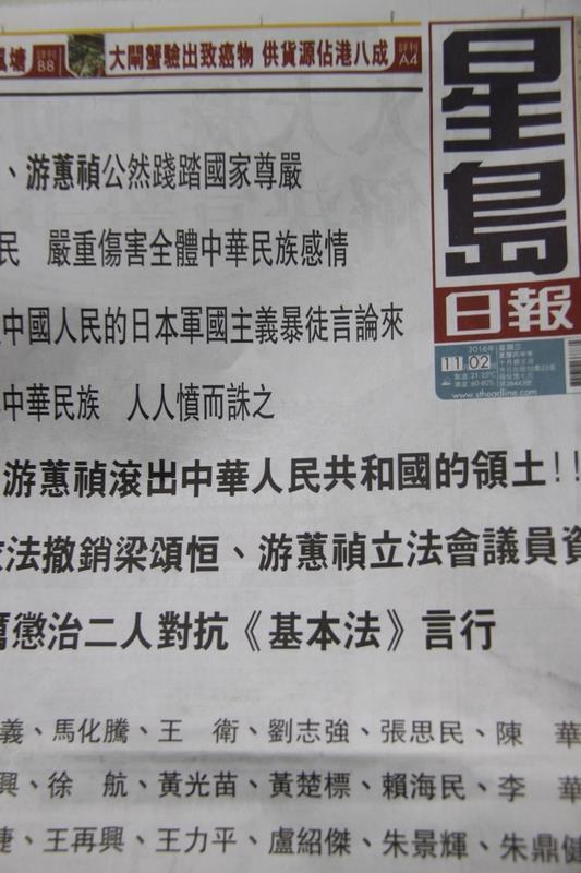 香港“青年新政”候任议员梁颂恒和游蕙祯的“宣誓辱国”引发大陆商界名人不满。据台湾“中央社”11月2日报道,腾讯创办人马化腾及创维创办人黄宏生等近100人,在11月2日的《星岛日报》头版刊登联名广告,指梁、游两人“侮辱中国人民,严重伤害全体中华民族感情”,广告要求两人“滚出中华人民共和国的领土”,并要求依法撤销两人的议员资格。