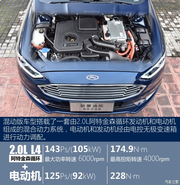 不过最值得一提的是,新款蒙迪欧还推出了混合动力版车型,它搭载了2.0L阿特金森发动机,热效率高达40%,最大功率为105kW,具有174.9N·m的最高扭矩,电动机功率为92kW,最大扭矩228N·m。搭载了一套eCVT电控无极变速箱来调配电动机和汽油发动机之间的动力,不过混合动力车型的动力输出并不能通过汽油发动机和电动机账面数据1+1这么简单计算得来。它的动力表现究竟如何,我将在下面的文章中为大家揭晓答案。