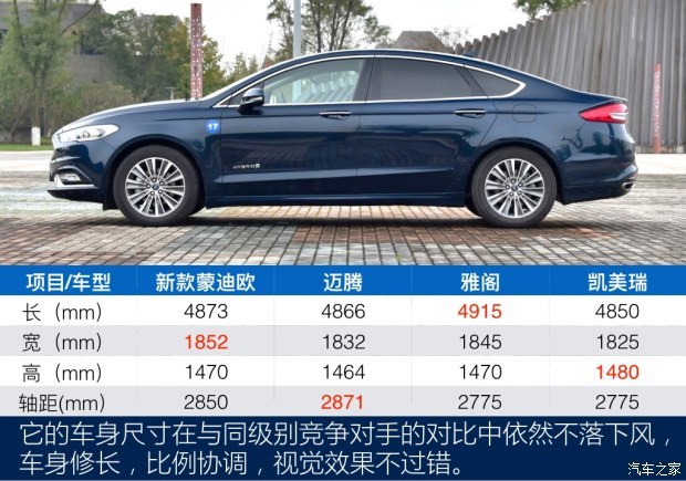 车身尺寸方面,这次试机的蒙迪欧混动版的长宽高分别为:4873/1852/1470mm,轴距为2850mm。虽然它已经上市多年,但现在看来在车身尺寸方面仍有不弱的竞争力。