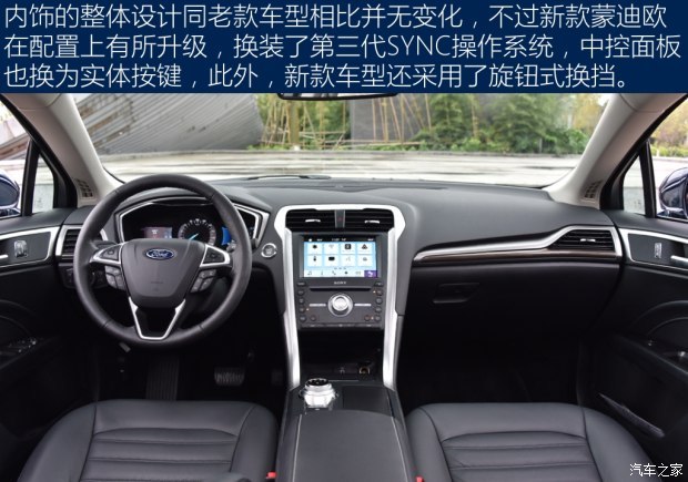 不过细看之下还是能发现它的变化,首当其冲的就是旋钮式的换挡了,老款车型的传统挡杆被一颗与福特金牛座上造型一致的换挡旋钮所取代。其实对自动挡车型来讲,传统挡杆和旋钮式换挡的操作便利性并无太大区别,不过旋钮式换挡的“档次感”确是传统挡杆所无法带来的。