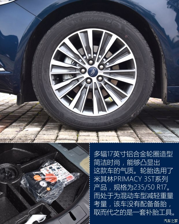 新车配备的是规格为235/50 R17的轮胎,混动版车型没有配备备胎,取而代之的是一套补胎工具,在轮圈的造型方面,新款蒙迪欧继续保持了它一贯的时尚感,多辐轮圈的造型相当简洁好看。