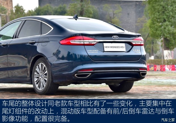 车尾是新款蒙迪欧变化较大的地方,设计师重新设计了它的尾灯,并在左右尾灯之间插入了一根镀铬条辐使车尾的视觉中心向水平方向延伸,而它双边共两出的排气管设计在新款车型上的到了保留。