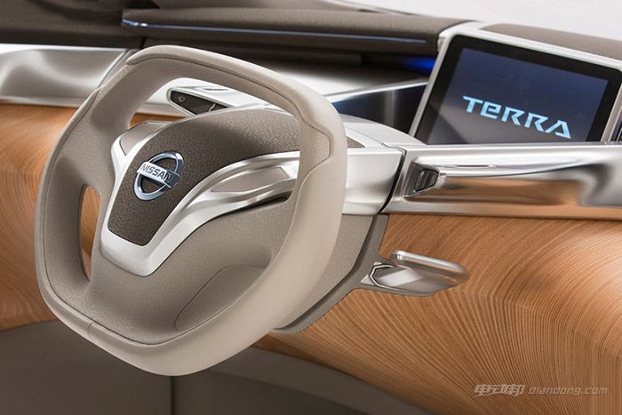 日产TeRRA使用了类似雕塑的设计理念并加入了大量的金属拉丝装饰,整体的风格偏年轻运动。发布车型未配备仪表盘,而是使用了一款狭长的液晶屏将"仪表盘"和"多媒体屏幕"连为一体,内部可显示所有的车辆信息以及电池电量等信息。